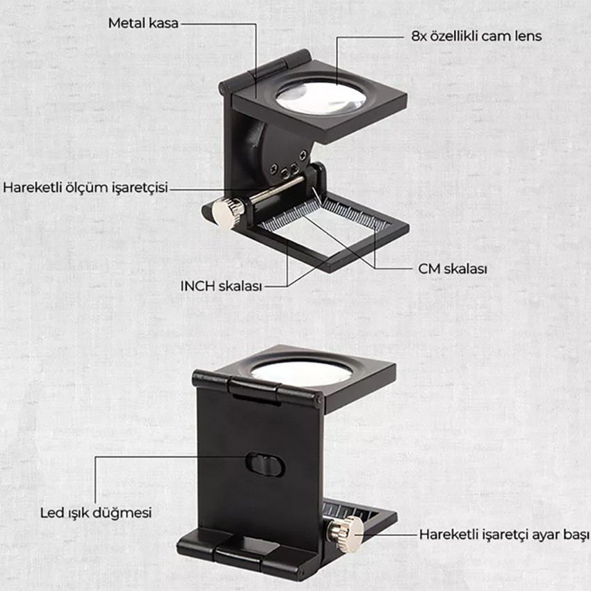 - Mini büyütecin üzerinde bulunan açılıp kapatılabilen 2 adet led ışığı ile karanlık ve loş ortamlarda daha kolay inceleme yapma olanağı bulunmaktadır.
