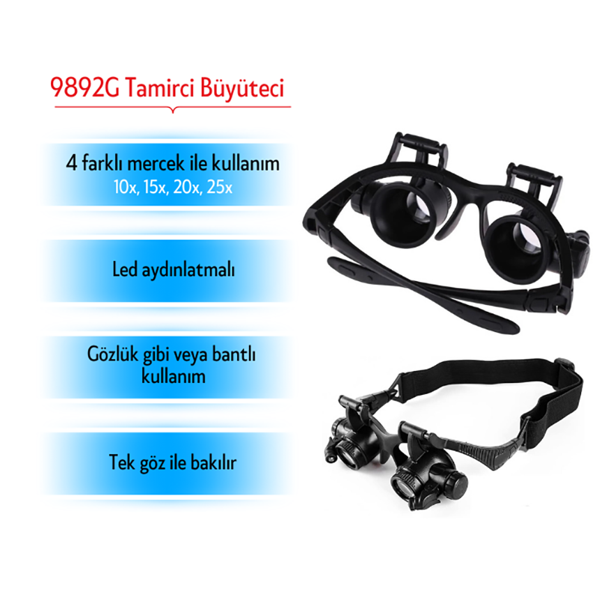- 9892G gözlük büyüteç toplamda 4 adet olmak üzere (10X, 15X, 20X ve 25X) mercek çeşitlerine sahiptir.