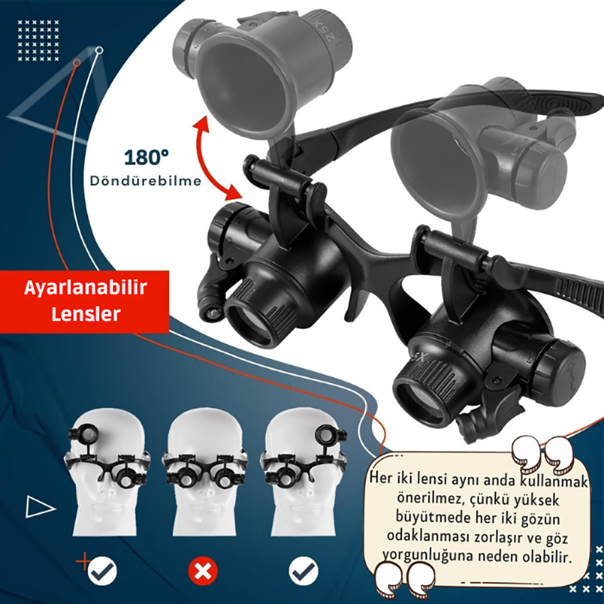 LED ışıklı kafa büyüteci; değiştirilebilir lensleri ve güçlü LED aydınlatması ile küçük parçaların detaylı incelenmesini sağlar. Kuyumculuk, elektronik tamiri, modelcilik ve hassas montaj işleri için idealdir.