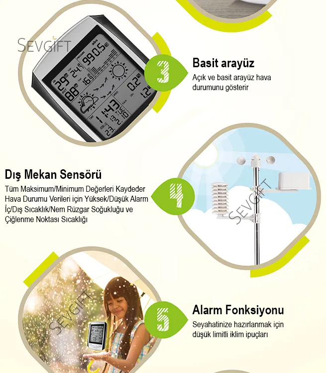 - Hava ikonlarıyla (güneşli, bulutlu, yağmurlu) hava tahmin göstergesi bulunmaktadır. (%60 doğruluk payıyla)