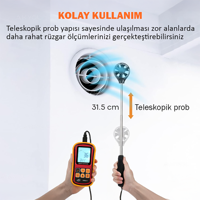 - Bu dijital anemometre cihazının öne çıkan özelliği, teleskopik yapıya sahip pervane sistemidir.