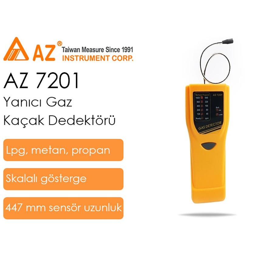 AZ 7201 gaz kaçak dedektörü cihazı; doğalgaz, metan (CH4), propan (C3H8, sıvılaştırılmış petrol gazı, LPG) gibi yanıcı özellikteki gaz çeşitlerinin kaçak tespitini yapabildiğiniz hassas bir dedektör cihazıdır.