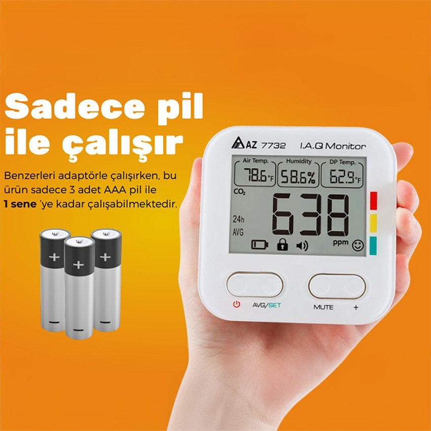 - Cihazın en büyük özelliği; benzerlerinden farklı olarak, adaptör ile değil sadece pil ile çalışabilmesidir. AZ 7732 ölçüm cihazı sadece 3 adet AAA pil ile 1 yıl izleme imkanı sağlayan olağanüstü güç tasarrufu özelliği sahiptir.