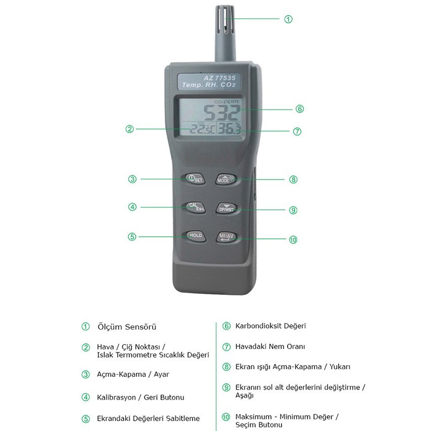 - AZ 77535 el tipi karbondioksit cihazı ile hassas ölçümler yapabilirsiniz.