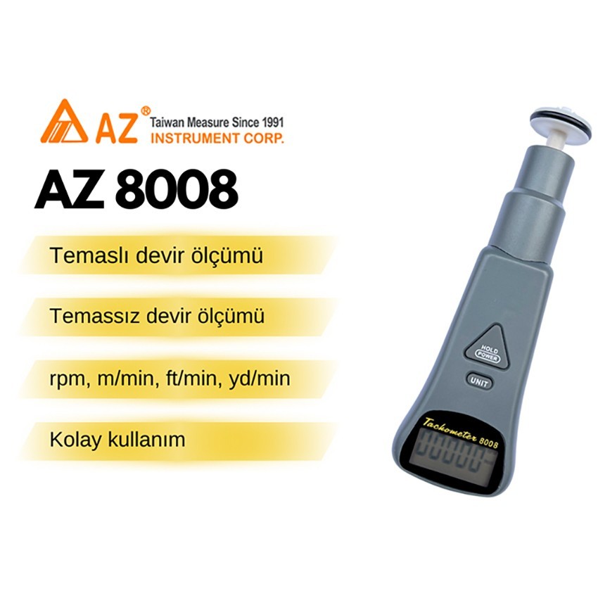 - AZ 8008 takometre ürünümüz temaslı ve temassız devir ölçümü yapabilmektedir.