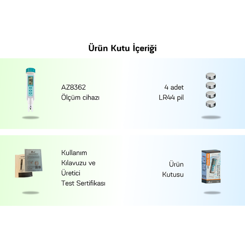 - Ürünün kutu içeriği; bir adet AZ Instrument 8362 ölçüm cihazı, 4 adet LR44 pil, kapsamlı kullanım kılavuzu ve üreticiye ait test belgesinden oluşmakta olup, kullanıcıya eksiksiz ve hazır bir başlangıç seti sunmaktadır.