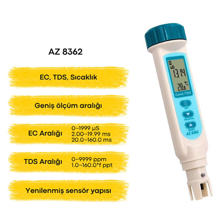 - AZ 8362 elektriksel iletkenlik ve TDS ölçüm cihazı; su çözeltilerinde EC (iletkenlik), TDS (Toplam Çözünmüş Katı Madde) ve sıcaklık ölçümleri yapabilir. EC İletkenlik birimi olarak µS ve mS, TDS birimi olarak ppm ve ppt kullanılır.