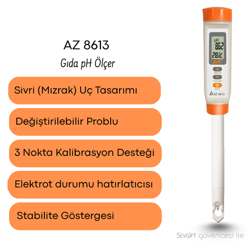 AZ 8613 Gıda pH Ölçer, değiştirilebilir problu ve sivri (mızrak) uçlu tasarımı sayesinde peynir, et, hamur ve yoğurt gibi yarı katı gıdalarda doğrudan ve hassas pH ölçümü yapar. 3 nokta kalibrasyon, stabilite göstergesi ve elektrot uyarı sistemi ile güvenilir sonuç sunar. Gıda üretimi, et işleme, süt ve peynir üretimi ile fırıncılık uygulamalarında kalite kontrol için ideal profesyonel pH metredir.