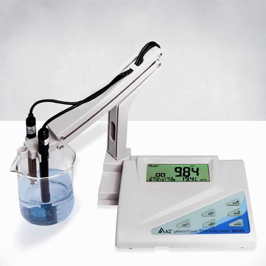 AZ 86505 masaüstü ölçüm cihazı, laboratuvar ve endüstriyel kullanım için ideal olan, pH, mV, TDS, Tuzluluk, mS ve uS ölçüm özelliklerine sahip, çok parametreli masa tipi bir test cihazıdır. Bu gelişmiş masa tipi pH metre, akrobat ölçüm kolları sayesinde sıvılarda hızlı ve güvenilir ölçümler yapmanızı sağlar.