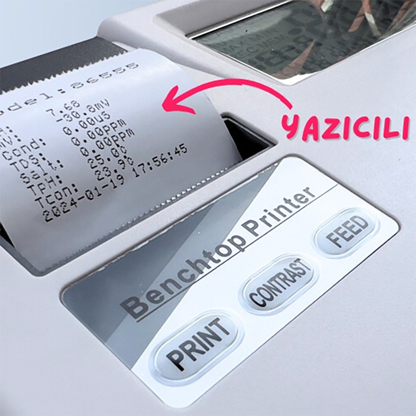 AZ 86555 masaüstü ölçüm cihazı; üzerindeki entegre yazıcısı ile ölçüm yaptığı ph, iletkenlik (ec ve tds) tuzluluk ve sıcaklık değerlerinin sonuçlarını ekran gösteriminden hariç olarak kağıt çıktısı olarak verebilen masa üzeri test cihazıdır.