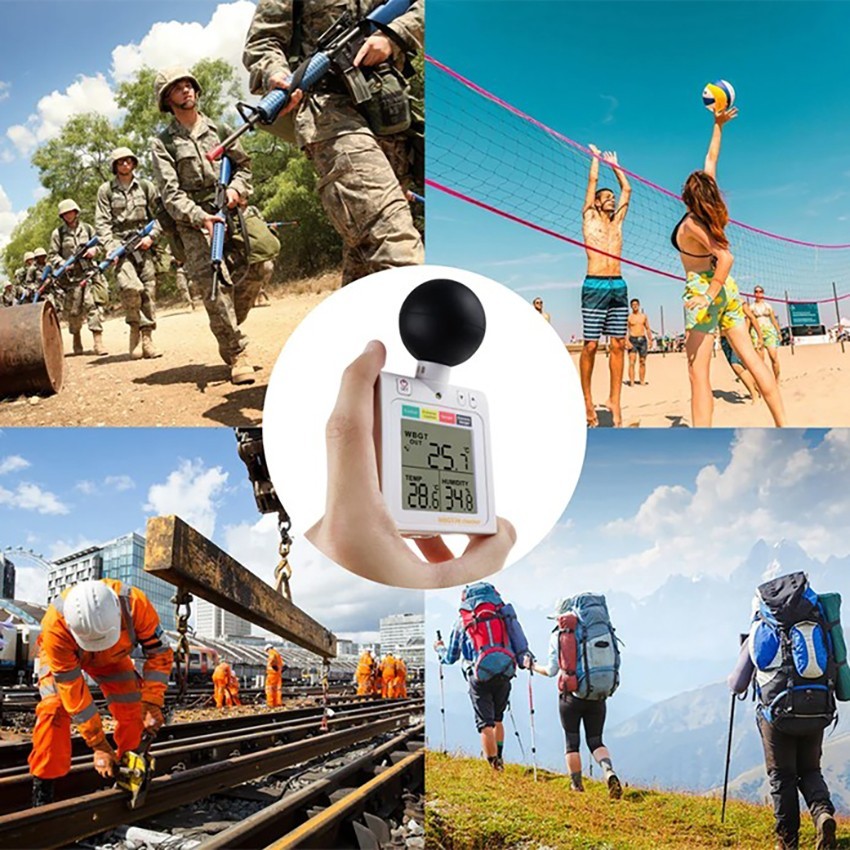 - AZ 87783 WBGT metre, kolayca taşınabilen küçük bir siyah topa sahiptir ve küçük siyah top belirli bir açıya sahiptir, böylece insan sıcaklığının, metre'nin doğruluğunu etkilemesi konusunda endişelenmenize gerek kalmaz. AZ87783 WBGT Checker ile yapılan ölçüm, dış mekan aktivitelerini izlemek ve insanların sıcak çarpması geçirmesini önlemek için iyi bir unsur olabilir.
