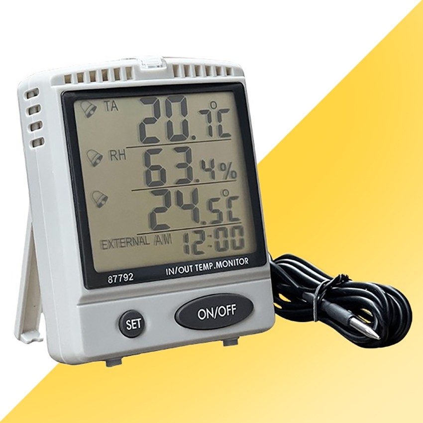 AZ 87792 alarm özellikli ölçüm cihazı; iç mekan sıcaklık ve nem, 2 metre kablosu sayesinde de dış mekan sadece sıcaklık ölçümü yapabilen, geniş dijital göstergeli ölçüm cihazıdır.