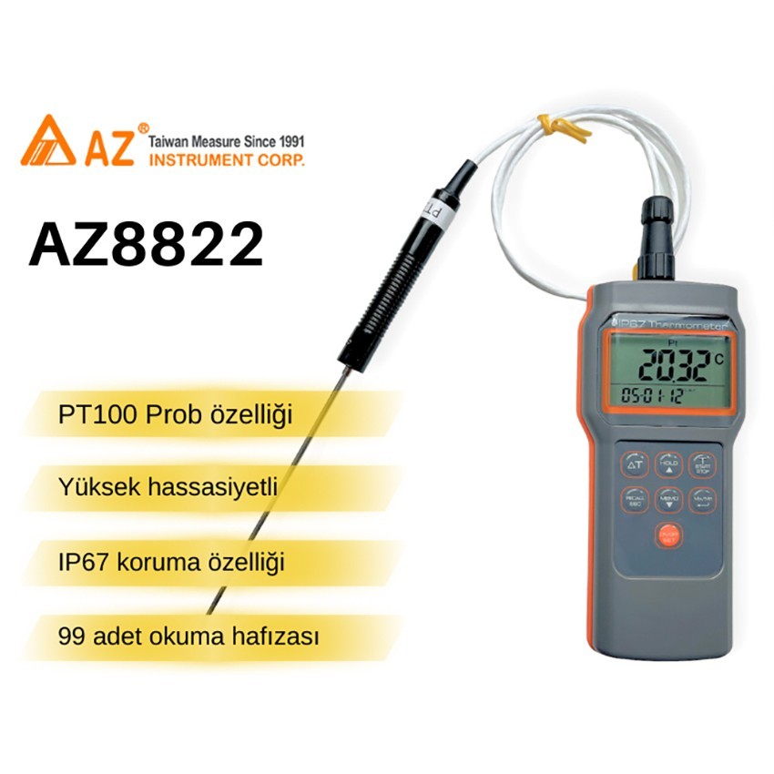 AZ8822 termometre; yanında gelen 15cm uzunluğundaki yüksek doğruluk ve uzun ömürlü PT100 özellikli probu ile 300℃ 'ye kadar ±0.15℃ hassasiyet ile sıcaklık ölçümü yapabilen dijital termometredir.
