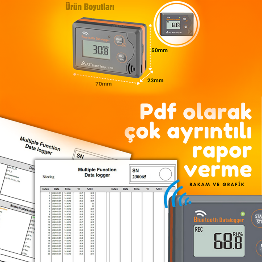 AZ 88362 sıcaklık ve nem kayıt cihazının ücretsiz olarak indirebileceğiniz "Nice Logger" isimli bir bluetooth iOS ve Android uygulaması mevcuttur. Ölçüm yaptıktan sonra yine rapor oluşturma bu uygulama üzerinden yapılır ve pdf veya csv formatları ile kaydedilebilir.