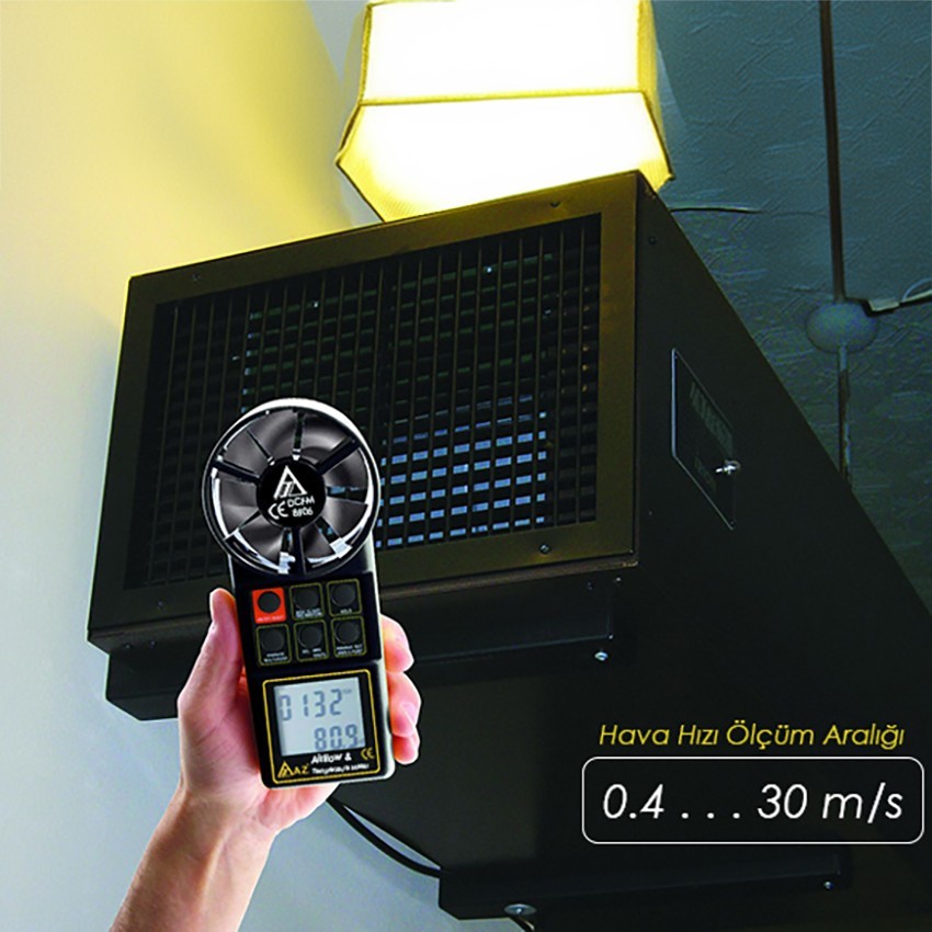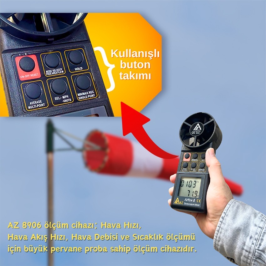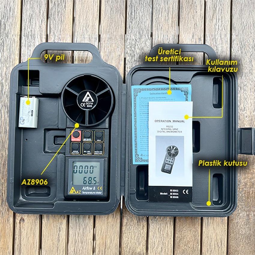 - AZ 8906 ölçüm cihazı; Hava Hızı, Hava Akış Hızı, Hava Debisi ve Sıcaklık ölçümü için büyük pervane proba sahip ölçüm cihazıdır.