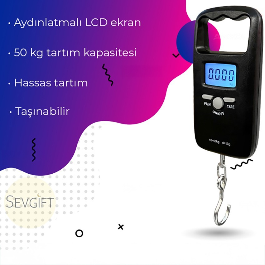 Dijital askı terazisi; 50 kilograma kadar ağırlık ölçümü yapabilen, 10 gram hassasiyete sahip taşınabilir bir el terazisidir. Bu dijital el tartısı, kolay ve rahat okunabilir mavi renkli LCD ekranı ile kullanıcı dostu bir tartım cihazıdır.
