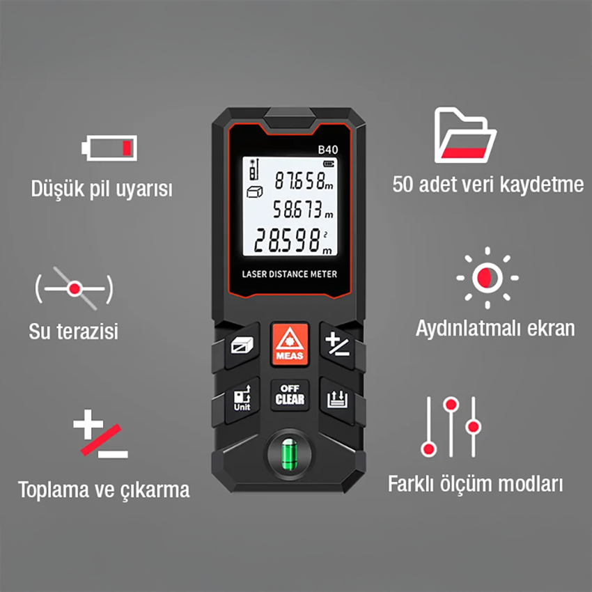 B40 temel seviye lazer mesafe ölçer; 40 metreye kadar ±1.5 mm hassasiyetle ölçüm yapabilen, aynı anda 3 farklı ölçüm değerini ekranda gösterebilen, 50 adet ölçüm kaydını hafızasında tutabilen ve gelişmiş alan, hacim ve Pisagor hesaplama fonksiyonlarıyla profesyonel kullanımlar için tasarlanmış kompakt bir ölçüm cihazıdır.