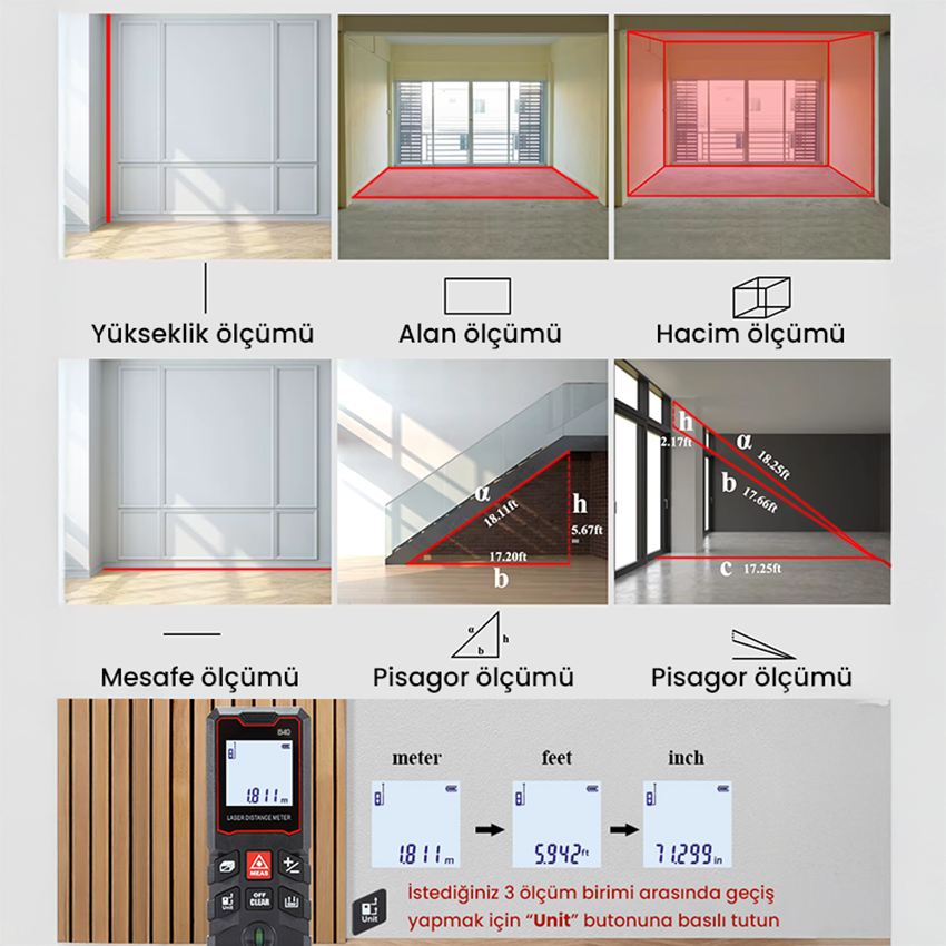 - Cihaz, metre, inç ve feet birimleri arasında geçiş yapabilir. Bu özellik, farklı ölçü sistemleriyle çalışan kullanıcılar için büyük kolaylık sağlar.