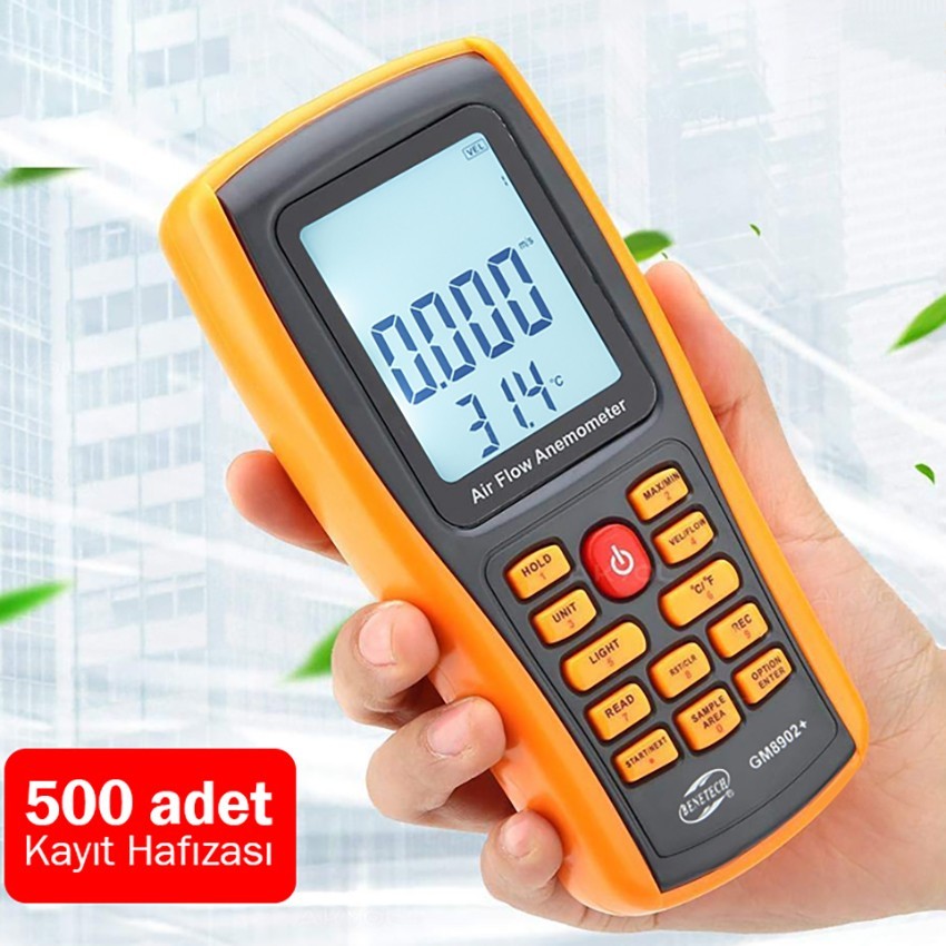 Benetech GM8902+ plus ölçüm cihazı; meteoroloji, denizcilik, yelken, paraşüt sporları, havacılık ve inşaat gibi alanlarda havanın hızını, sıcaklığını ve debisini ölçebilen bir dijital anemometredir. 500 adet ölçüm kaydedebilme kapasitesi ile hassas ölçümler sağlar ve geniş bir kullanım alanına sahiptir.
