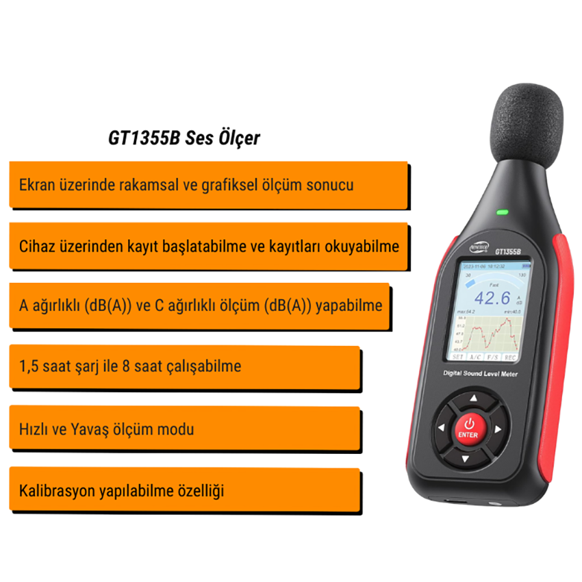 Benetech GT1355B ses ölçer cihazı; 43.000 adet kayıt yapabilen, kalibrasyon yapılabilme imkanı bulunan, renkli göstergesi ve ayrıntılı menüsü ile