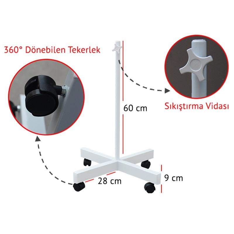 4 Tekerlekli Büyüteç Standı, üzerine akrobat kollu büyüteç monte edilerek kullanılabilen, dört tekerleği sayesinde kolayca bir yerden başka bir yere taşınabilen pratik bir büyüteç ayağıdır. Sağlam yapısı ve hareket kabiliyeti ile çeşitli sektörlerde rahatlıkla kullanılabilir.