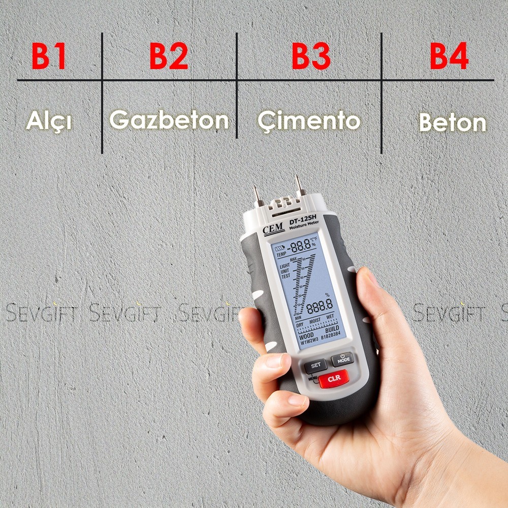 Cem DT 125H ahşap ve beton nem ölçer cihazı; kereste, kağıt, karton gibi ahşap malzemelerin ve alçı, beton, harç ve mastar gibi inşaat malzemelerinin nemini ölçer.