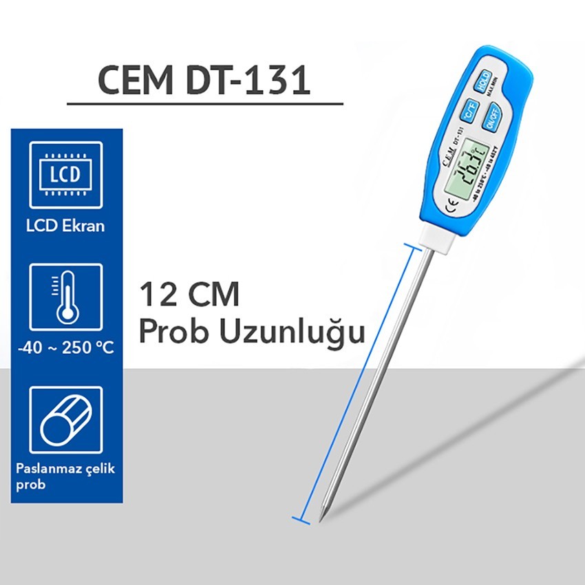 CEM DT-131 saplama problu gıda termometresi; 12 cm prob uzunluğuna sahip dijital bir termometre cihazıdır.