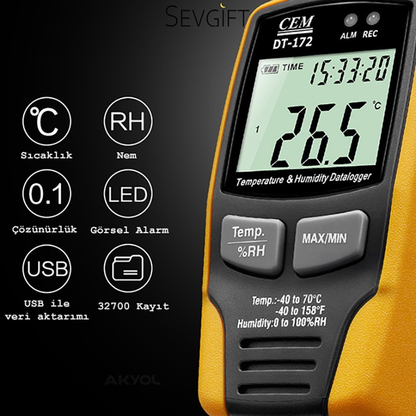 Cem DT-172 datalogger ortam sıcaklık ve nem kayıt cihazı; toplam 32700 adete kadar kayıt tutabilen hafızaya sahip, -40°C 'den başlayarak 70°C' ye kadar sıcaklık, 0' dan %100' e kadar da nem ölçümü yapabilen hassas datalogger cihazıdır.