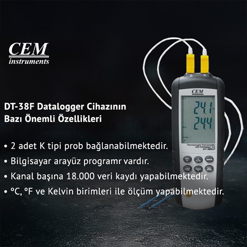 - CEM DT-38F sıcaklık kayıt ölçüm cihazı; hem K tipi, hem de J tipi termokupl lar ile çalışabilen bir datalogger cihazıdır.