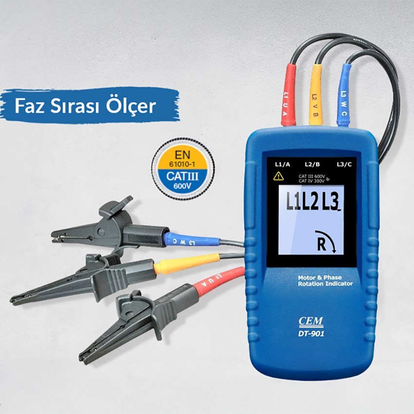 - Cem DT-901 aynı zamanda döner tip faz sırası ölçüm cihazıdır. Cihaz ekranında dönüş yönüne göre sağa doğru veya sola doğru ok çıkmaktadır.