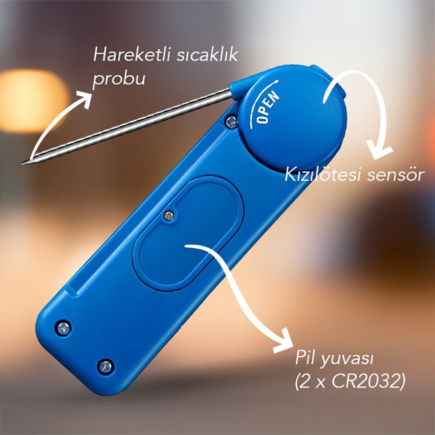 AMT 206 gıda termometresinde bulunan hem daldırma tipi probuyla, hem de infrared termometresiyle temaslı veya temassız sıcaklık ölçümü yapabilmektedir.