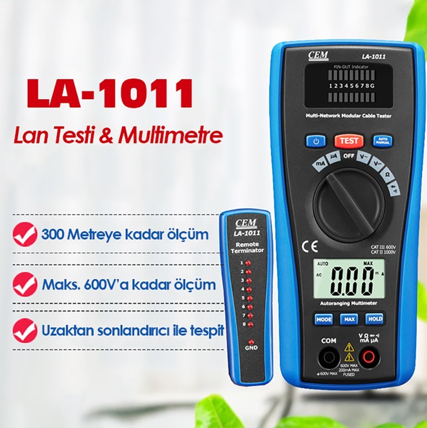 Cem LA-1011 model ölçüm cihazı; akım, voltaj ve direnç gibi multimetre işlevli ölçümlerinin yanı sıra, ağ kablolarının testi, telefon hatlarını ve diğer hatları test etmek için kullanılan hassas test cihazıdır.