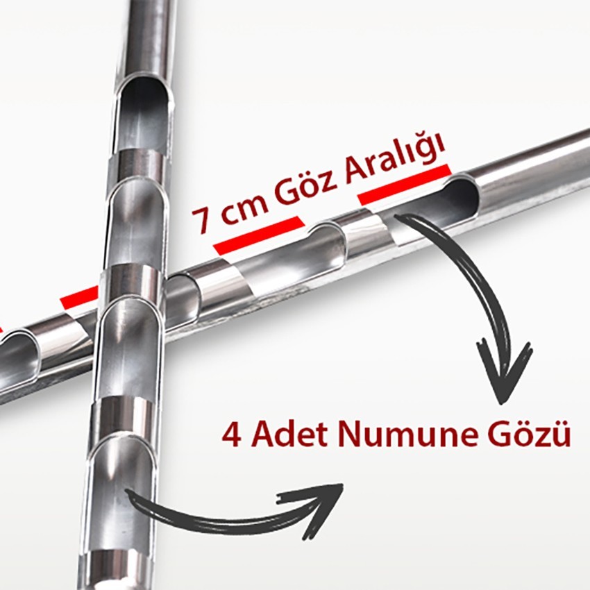 Çuval numune alma sondası; 4 gözlü yapıya sahip, sivri uçlu yapısı ile çuvallardan numune alma amaçlı kullanılabilen dayanıklı sondadır. Kullanım amacı; ürün dolu çuvala bu sondayı saplayarak farklı noktalardan dört kanala ürünü doldurup numune almaktır.
