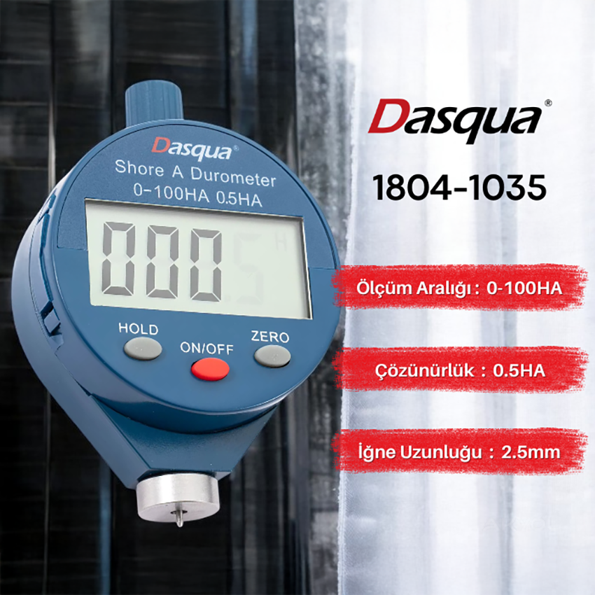 - Dasqua 1804-1035 dijital shore metre cihazı 0 - 100 HA değer arasında; yumuşak kauçuk, silikon, poliüretan ve diğer kauçuk benzeri malzemelerin sertliğini ölçmek için kullanılan bir cihazdır.
