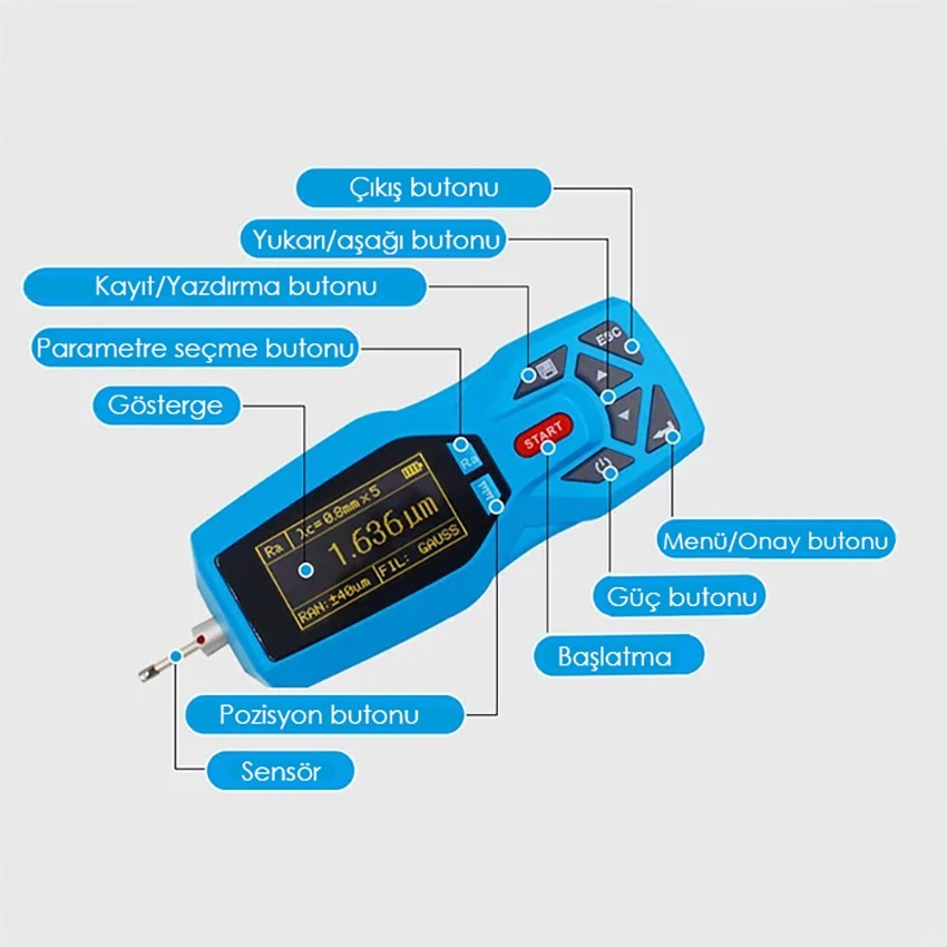 Parça yüzeyinin pürüzlülüğü ölçülürken, sensör parçanın yüzeyine yerleştirilir ve ardından yüzey boyunca sabit bir hızda hareket ettirilir. Sensör, içindeki keskin uçlu kalemiyle yüzeyin pürüzlülüğünü algılar. Bu işlem sonucunda elde edilen analog sinyal, veri toplama sistemine girer ve DSP çipi tarafından dijital filtreleme ve parametre hesaplaması ile işlenir. Ölçüm sonucu dijital ekranda okunabilir ve PC ile iletişim kurabilir.
