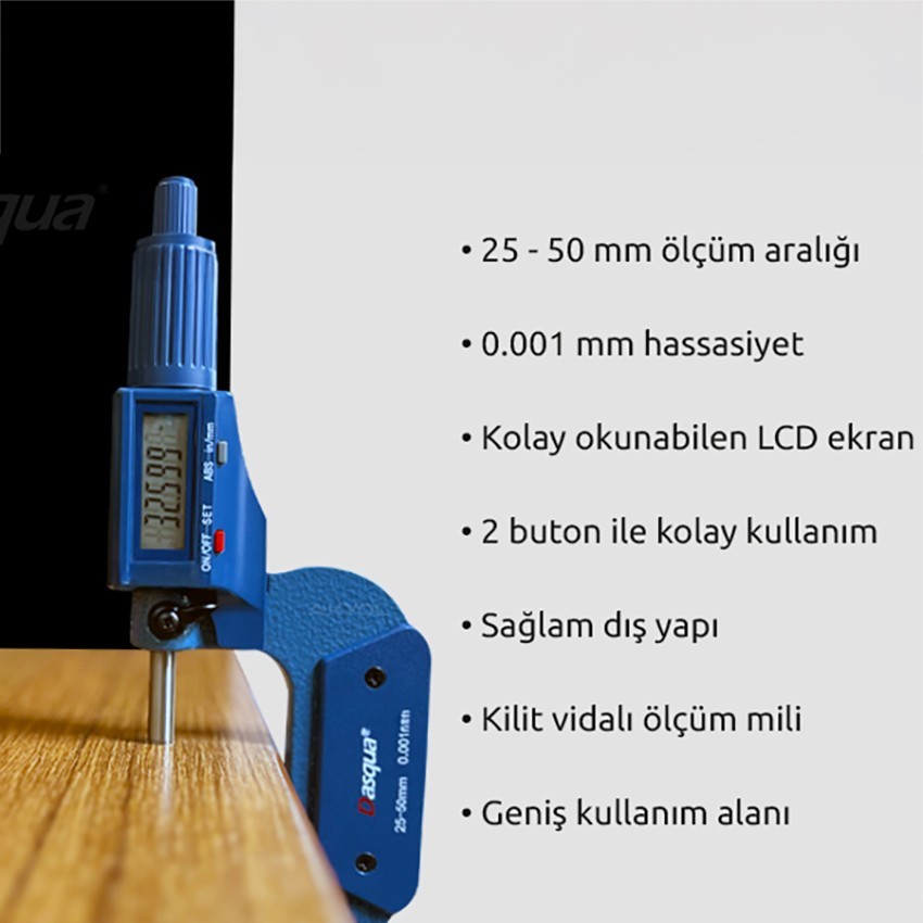 Dasqua 4210-2110A Dijital Mikrometre cihazı ile 25 ile 50 mm aralığında hassas kalınlık ölçümü yapabilirsiniz. Yapacağınız bu ölçümleri LCD ekranından kolayca takip edebilirsiniz.