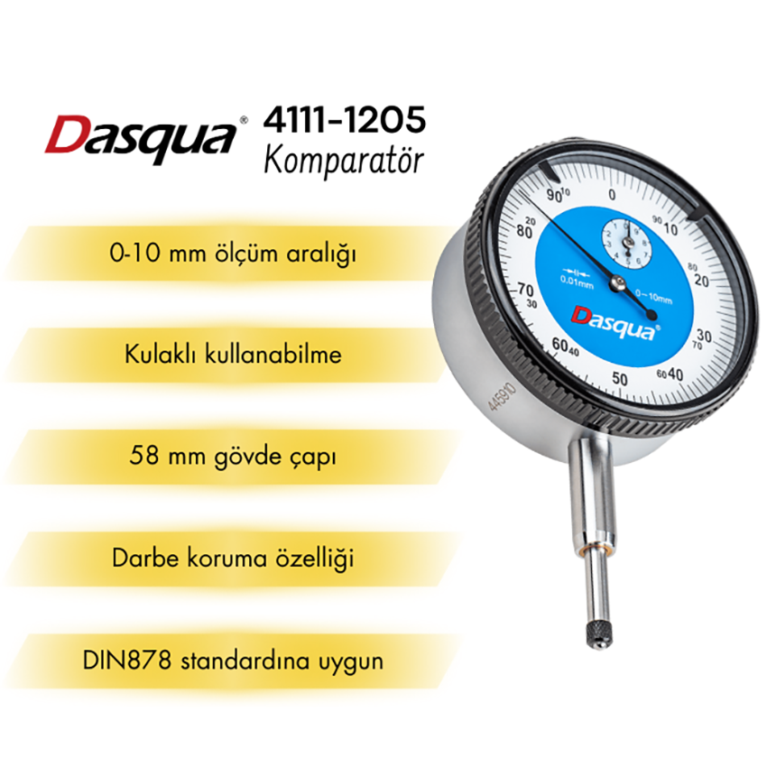 Dasqua 5111-1205 komparatör saati; genellikle üretim, laboratuvar, mekanik alanlar ve diğer endüstriyel alanlarda mikron seviyesindeki küçük ölçümleri belirlemek için kullanılan bir ölçüm cihazıdır.