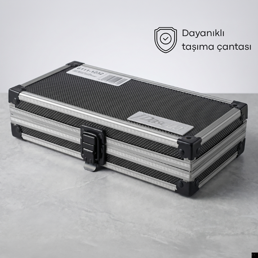 Dasqua 6111-1232 kalibrasyon mastar seti; kumpas, mikrometre, komparatör, kalınlık ölçer ve benzeri hassas ölçüm cihazlarının kalibrasyonu, doğrulanması ve referans kontrol işlemleri için kullanılan, yüksek hassasiyetli ve standardize ölçülerde üretilmiş kalite 1 özelliğine sahip profesyonel bir mastar blok setidir.
