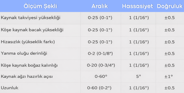 - Takviye yüksekliği, alt kesme derinliği, köşe kaynak ayak yüksekliği, köşe kaynak boğaz kalınlığı, hizasızlık ve uzunluk gibi temel kaynak ölçümlerinin pratik şekilde kontrolünü destekler.