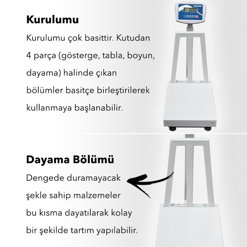 - Kantarın tartım platformuna sabitlenmiş dayama bölümü bulunmaktadır. Dengede duramayacak şekildeki tartılacak malzemeler bu kısma dayatılarak kolay bir şekilde tartım yapılabilir.