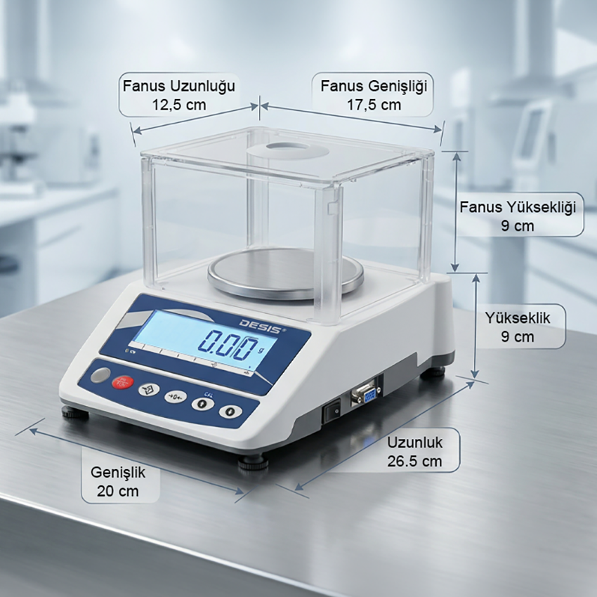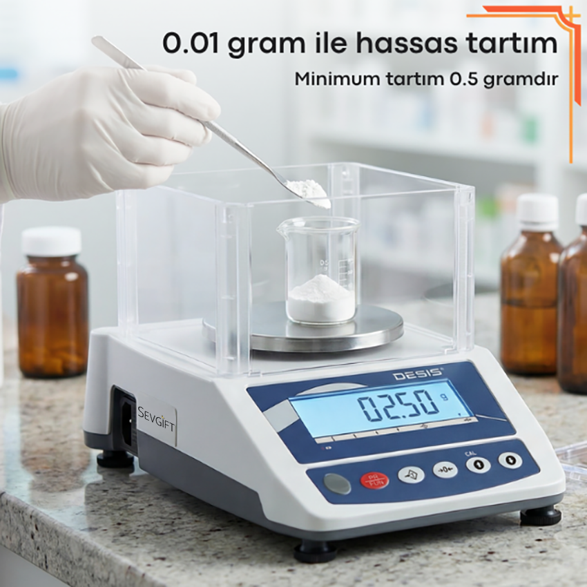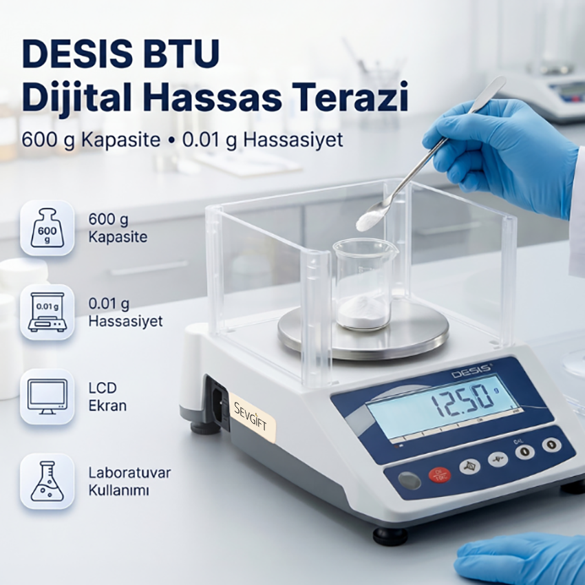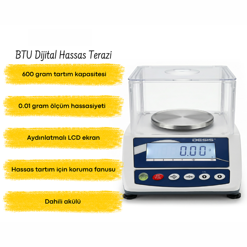 Desis BTU dijital hassas terazi, hassasiyet ve güvenilirliğin ön planda olduğu tartım uygulamaları için geliştirilmiş; 600 gram tartım kapasitesi ve 0.01 gram