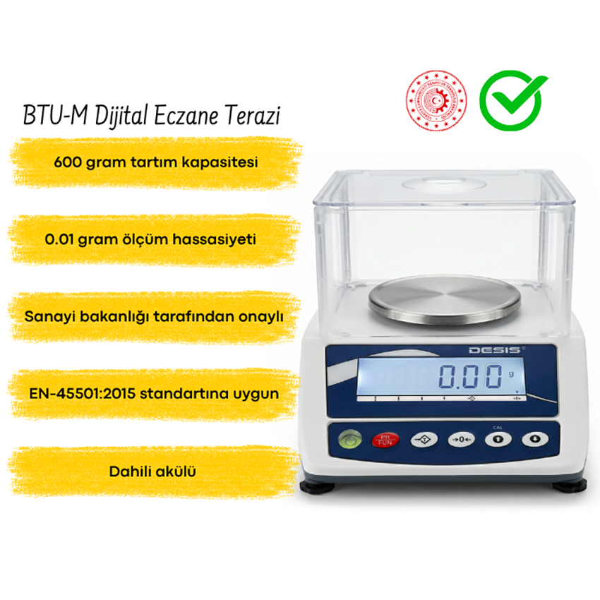 - Desis BTU-M dijital onaylı eczane terazisi, eczaneler, laboratuvarlar, sağlık kuruluşları ve hassas tartım gerektiren profesyonel alanlar için geliştirilmiş güvenilir bir tartım çözümüdür.