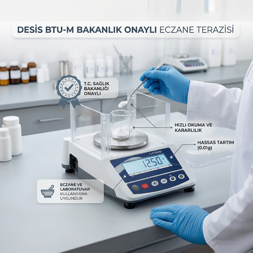 Desis BTU-M bakanlık onaylı eczane terazisi, eczanelerde hassasiyet, güvenilirlik ve yasal uygunluğun kritik önem taşıdığı tartım uygulamaları için