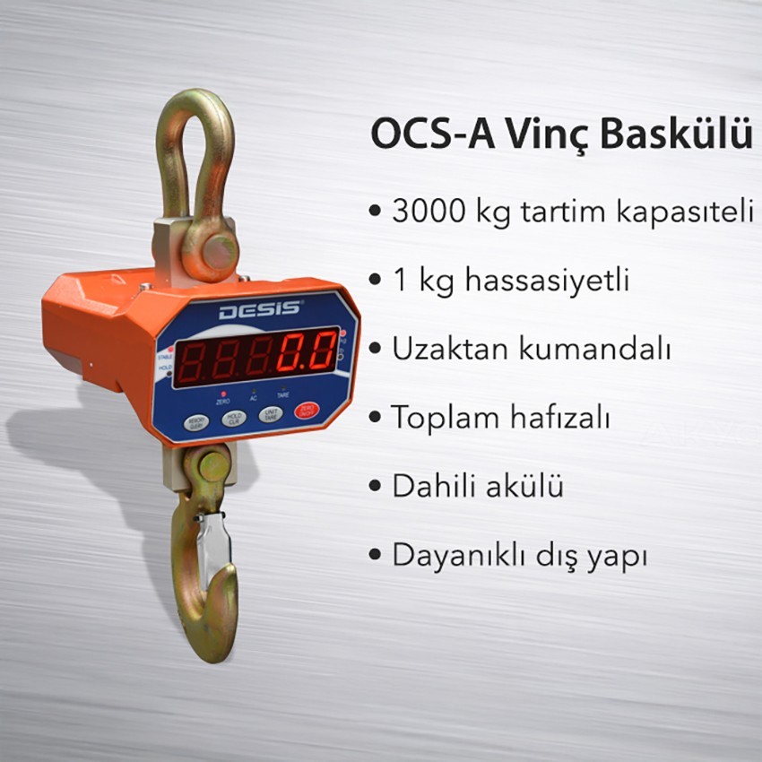 Desis OCS-A vinç baskülü maksimum 3 tona kadar tartım yapabilen ve 1 kilogram hassasiyetli uzaktan kumandaya sahip bir tartım cihazıdır. Döküm halka ve döküm kancası ile dayanıklı bir dış yapıya sahip kaliteli bir vinç basküldür.