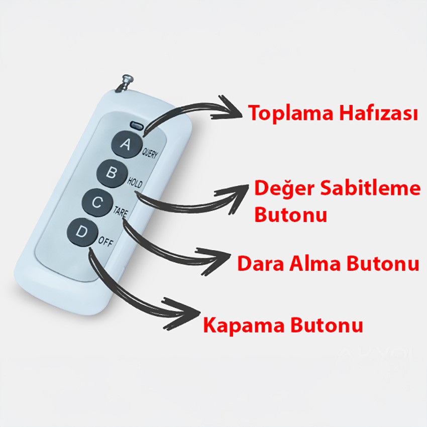 - Uzaktan kumandası ile cihazı uzak mesafelerden kapatabilir, darasını alabilir, ekrandaki değeri sabitleyebilir ve toplam hafıza işlemlerini yapabilirsiniz.