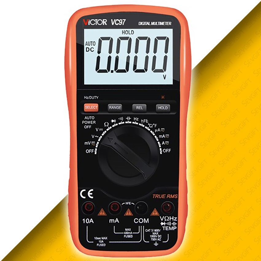 Victor VC97 dijital multimetre avometre; yüksek doğruluk ve yüksek performans ile DC ve AC gerilim, DC ve AC akım, direnç, kapasitans, frekans, sıcaklık, diyot ve süreklilik ölçmek için kullanılan, geniş ekranlı elektronik multimetre çeşididir.