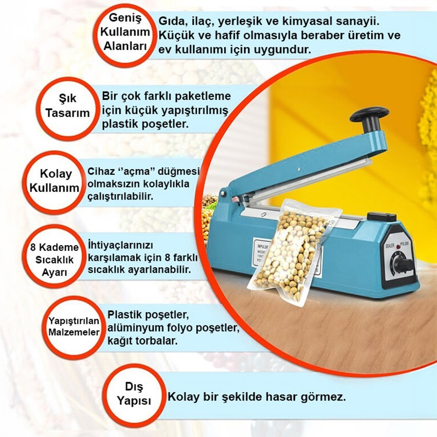 - Bu poşet ağzı kapatma makinası 20 cm poşet yapıştırma uzunluğuna sahiptir.