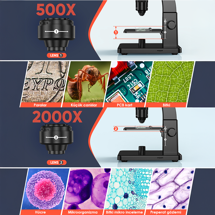 50X ile 500X yakınlaştırmada lens 1, 100X ile 2000X arasında lens 2 kullanılır