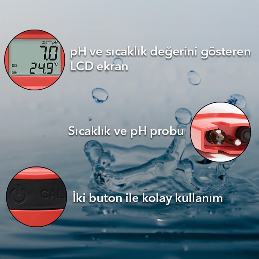 - Cihazın kaliteli ve okunaklı bir LCD ekranı bulunmaktadır. LCD ekranın üst kısmında ph ölçümü, alt kısmında ise sıcaklık ölçümleri gösterilmektedir.