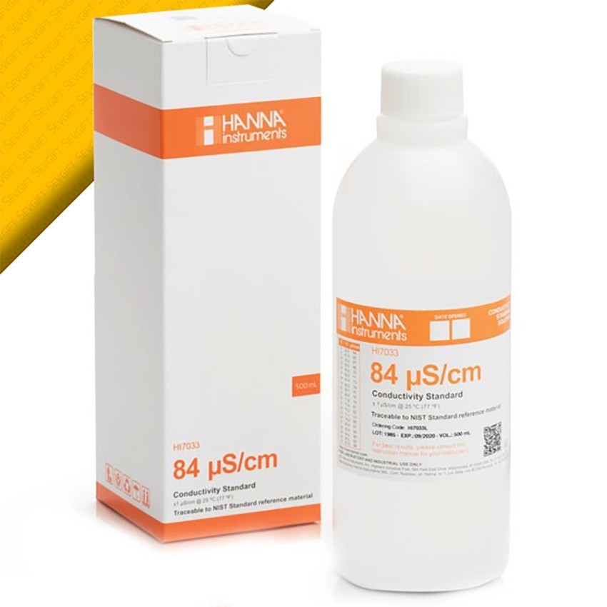 HI7033L iletkenlik kalibrasyon çözeltisi, 500 mL kapasiteli şişe içerisinde bulunan üstün kaliteli 84 µS/cm kalibrasyon solüsyonudur. Kalibrasyon çözeltileri cihazlar için oldukça önemlidir, doğru sonuç için iyi kalibrasyon yapılması gerekir.